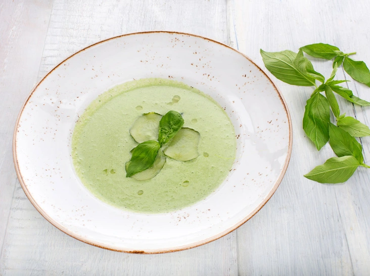 Гаспачо разлить по чашам. Сверху украсить сыром фета, арбузом, поджаренными тыквенными семечками и остатками мяты.