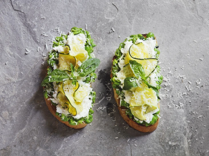 Выложить чиабатту на блюдо. Поверх каждого ломтика выложить по 1 ложке рикотты. Аккуратно разложить смесь с горошком на каждый кусочек чиабатты.