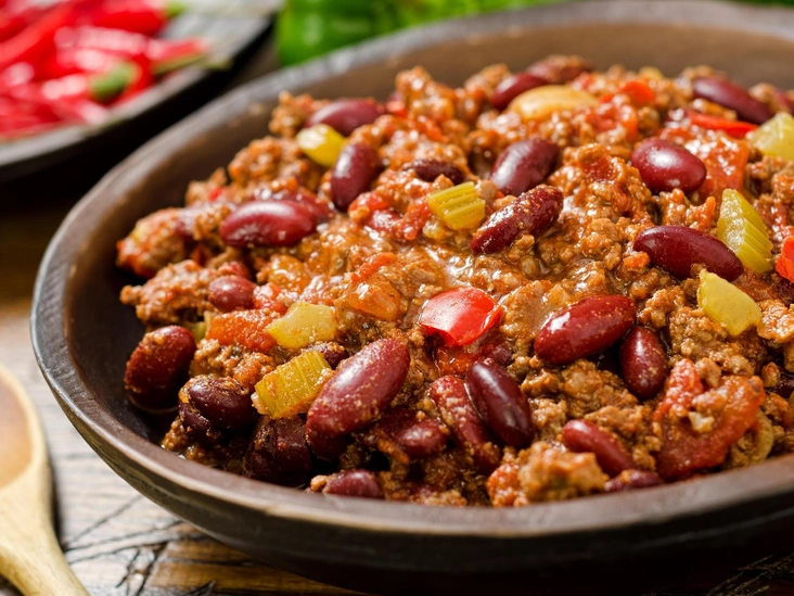 Чили кон карне дословно переводится, как «чили с мясом» — потому что его основные ингредиенты это говядина и красный перец чили. Рецепт появился в Мексике XIX века и стал самым популярным блюдом рабочего класса — а теперь его готовят и во всем мире. Вариации есть разные: с фасолью, кукурузой, помидорами, рисом и анчоусами. Мы предлагаем приготовить чили кон карне со свиным и говяжий фаршем, а также фасолью и помидорами в собственном соку по рецепту Джейми Оливера.