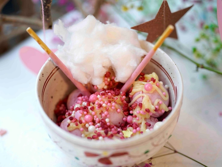 Для декора посыпьте такояки воздушными рисовыми шариками, сублимированной малиной, украсьте печеньем-палочками Pocky и уложите сверху облачко из сладкой ваты. В общем, для украшения в ход идет все самое милое и розовое!