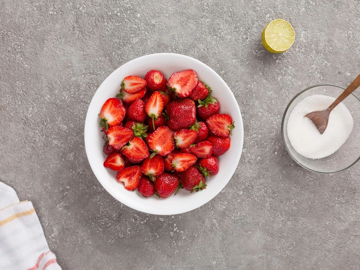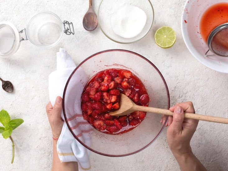 Смешайте подготовленные фрукты с 1/4 или 1/2 стакана сахара или другого подсластителя (ориентируйтесь на свой вкус и пристрастие к сладкому) и 1–2 столовыми ложками лимонного сока в миске для смешивания в микроволновой печи. Если вы используете ягоды, слегка разомните их, чтобы они выпустили сок. Оставьте фрукты вымачиваться не менее получаса, пока сахар не растворится, а фрукты не станут сиропообразными.
