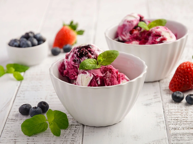 Взбейте в блендере кефир, чернику и сахарную пудру. Отдельно взбейте яичные белки до крепкой пены. Аккуратно добавьте в кефирно-черничную массу и перемешайте до однородности. Перелейте смесь в форму и поставьте в морозильник. До тех пор, пока будет получаться, перемешивайте сорбет каждые 30 минут.