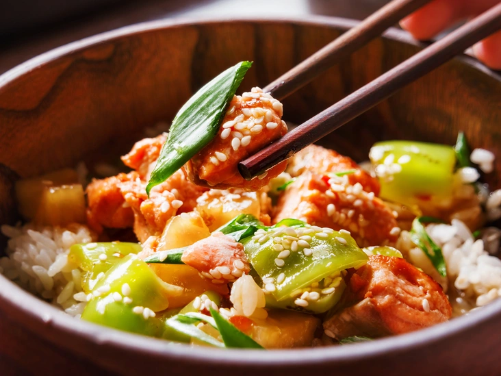 Будьте осторожнее с рисом, который богат углеводами и калориями. Откажитесь от жареного риса, в котором много жира, калорий и натрия, в пользу белого риса, приготовленного на пару, или, что еще лучше, коричневого риса. Также ограничьте потребление лапши. Жареная азиатская лапша содержит много калорий, углеводов, жира и натрия. Скажите «нет» блюдам из свинины, которые, как правило, содержат больше жира, чем другие варианты мяса. Избегайте тяжелых блюд с соусом, таких как апельсиновый цыпленок и пекинская говядина. Из соусов предпочтите соевый с низким содержанием натрия. Избегайте жирных, обжаренных во фритюре блюд, таких как жареные вонтоны, яичные рулетики, темпура, свиные ребрышки барбекю и крабовый рангун. Блюда в кляре или во фритюре замените приготовленными на пару и богатыми овощами. Жареные во фритюре закуски замените более полезным супом.