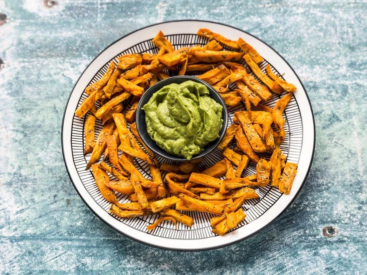 Получившийся хрустящий батат подавать со всевозможными соусами — сальса, гуакамоле, дзадзики (читайте также: Пять вкусных соусов на каждый день).