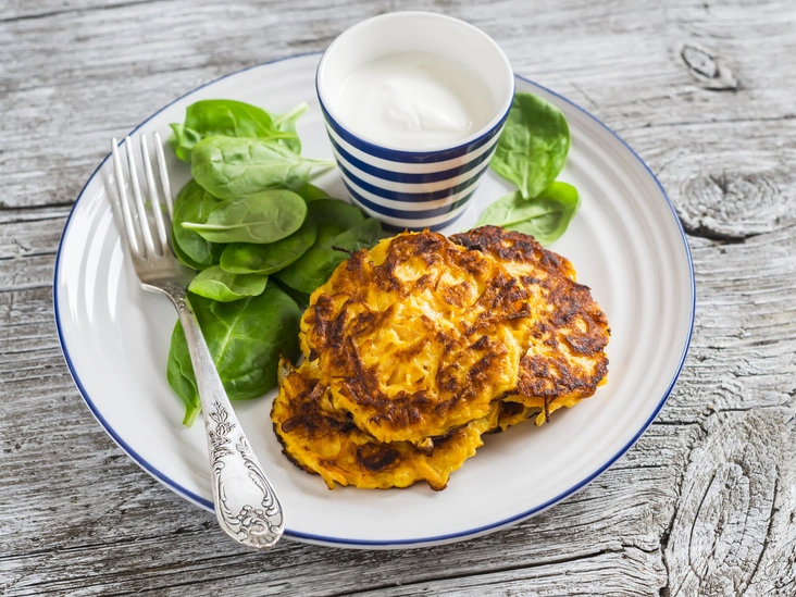 Затем пожарить небольшие блинчики на сухой сковороде (при желании можно добавить оливковое масло). Подавать с кленовым сиропом, медом или греческим йогуртом.