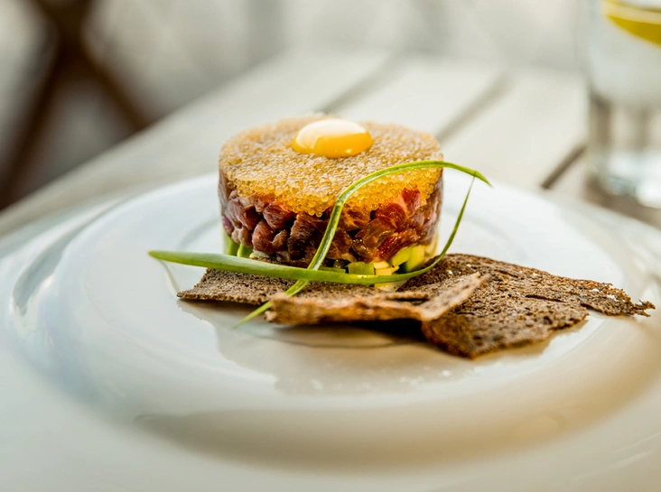 Севиче из говяжьей мраморной вырезки с миндалем