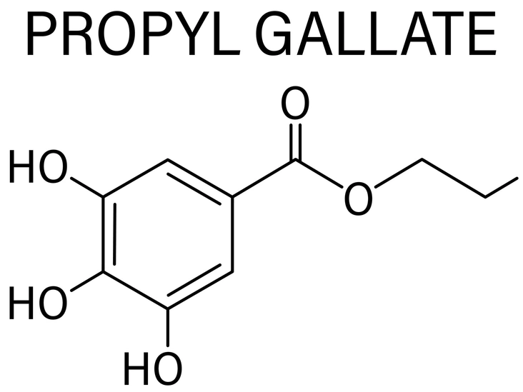 Пропилгаллат часто входит в состав мясных продуктов, растительных масел, картофельных палочек, жевательной резинки и готовых суповых смесей и предотвращает их порчу, в основном действует как консервант. Однако исследования показывают, что регулярное употребление продуктов с содержанием Propyl Gallate может вызвать рак толстой кишки и желудка, так что стоит быть осторожнее.