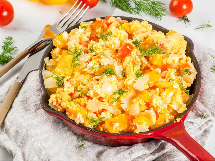 Прежде чем яйца начнут подгорать, снимите сковороду с огня, но продолжайте перемешивать, пока блюдо не достигнет нужной консистенции.