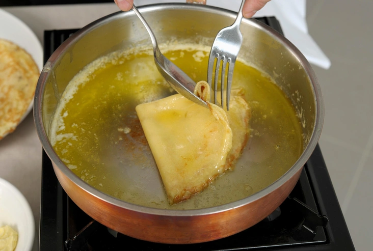 8. Поочередно выкладывайте готовые блинчики в смесь сахара, масла и ликера. Нужно дать каждому блину как следует пропитаться.