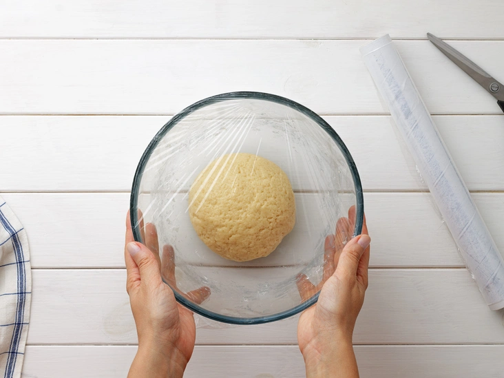 Отложите тесто в сторону, чтобы оно отдохнуло. Накройте миску полиэтиленовой пленкой и поставьте в теплое место. Установите таймер на 20 минут. Через 20 минут снимите пленку и просуньте пальцы под тесто на дальнем от вас краю чаши. Аккуратно растяните тесто вверх и к себе и сложите его ближней к вам стороной. Поверните миску на несколько сантиметров и повторите растягивание и складывание 5-6 раз, каждый раз поворачивая миску, растягивая и складывая тесто вокруг миски. Снова накройте миску пленкой и дайте постоять еще 20 минут.
