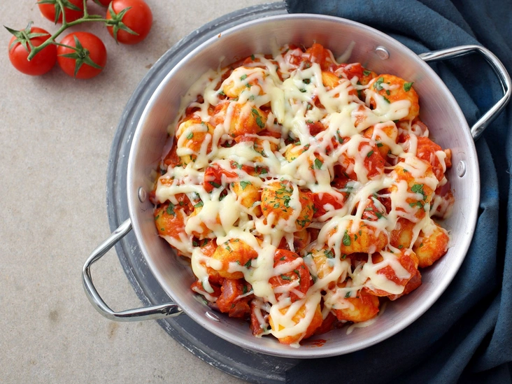 Отварите пельмени до полной готовности, добавив в кипящую воду лавровые листы и немного соли. Нарежьте помидоры кружками средних размеров и не забудьте аккуратно вырезать сердцевину. Смажьте форму для запекания сливочным маслом и выложите пельмени, после — томаты. Сверху натрите сыр (попробуйте пармезан, бри или камамбер) и поставьте в разогретую заранее до 180 градусов духовку на 20 минут. Любителям сыра мы советуем добавить еще немного моцареллы, равномерно распределив ее по поверхности. При высокой температуре эти несколько ингредиентов объединятся, а тесто образует корж. Последний штрих — свежий лук, зелень и щепотка черного молотого перца.