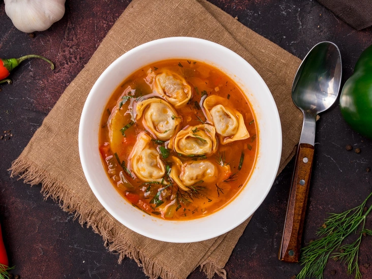 Обжарьте мелко нарезанный лук и помидоры на сковороде с небольшим количеством растительного масла. Смешайте воду и томатную пасту в кастрюле, доведите до кипения, параллельно добавляя смесь из перцев, соль и специи. Если вы хотите придать супу густоты, то добавьте еще томатной пасты, хорошо ее размешивая. В кипящую смесь опустите пельмени и подождите, пока они не всплывут. После этого добавьте в суп обжаренные лук и помидоры, мелко порезанный заранее чеснок и варите на протяжении 5-7 минут. Перед подачей посыпьте порции любимой свежей зеленью.