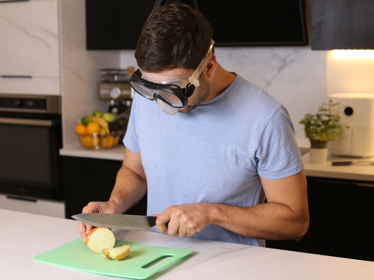 Если лук кажется вам особенно забористым, вы можете создать дополнительный барьер между выделяемым газом и вашими глазами. Помочь могут даже стандартные очки для зрения или солнцезащитные очки, но защита глаз с пломбой будет наиболее эффективной. Можно купить специальные «кухонные очки», но вообще очки для плавания или защитные строительные очки тоже могут подойти.
