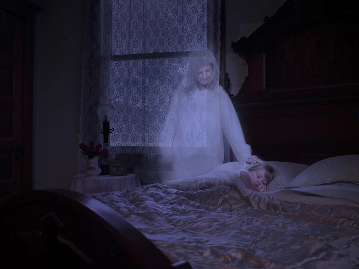 Эти события сохранились в моей памяти как набор коротких эпизодов. Вот я стою на краю кровати, а это создание обвивает меня руками, пытаясь успокоить. Я отчаянно сопротивляюсь. В другом эпизоде сижу в изголовье кровати, а призрак гладит мои волосы, словно говоря «не бойся».