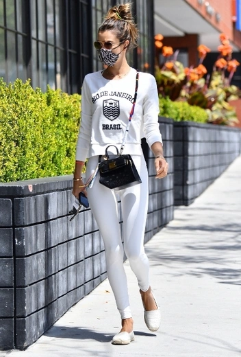Для Алессандры Амбросио весна и лето — любимое время года. Эти месяцы она с удовольствием посвящает своим главным хобби — пляжному волейболу, серфингу и занятиям йогой на открытом воздухе. В это время красотку редко можно увидеть не в спортивном бра и леггинсах, которые она выгуливает не только во время тренировок, но и в повседневности. Несмотря на свою страсть к яркой палитре оттенков, ради разнообразия Алессандра пробует сочетание в black&white и дополняет его свитшотом, любимыми эспадрильями и черной сумкой с разноцветным ремешком. Лук завершают защитная маска в принте зебра и солнцезащитные очки.