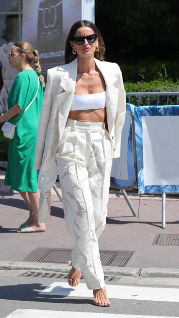 Знаменитость продолжает выгуливать лучшие образы в Каннах, выбирая для них беспроигрышные цвета — белоснежный и молочный. Так, Алессандра Амбросио примерила узкий топ, открывающий идеальный пресс, и надела костюм, который состоит из прямых брюк на высокой посадке и стильного свободного пиджака. В качестве обуви модель выбрала босоножки, подчеркивающие большие пальцы, и завершила аутфит сумкой, серьгами-кольцами и очками.