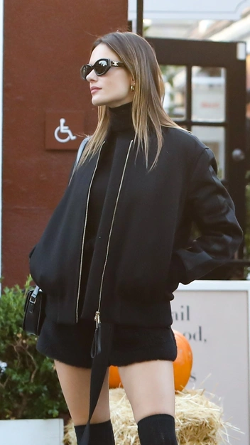 Алессандра Амбросио собрала стильный черный тотал-лук. Звезда взяла за основу короткие меховые шорты и бомбер, к которым добавила высокие гетры, солнцезащитные очки и сумку кросс-боди.
