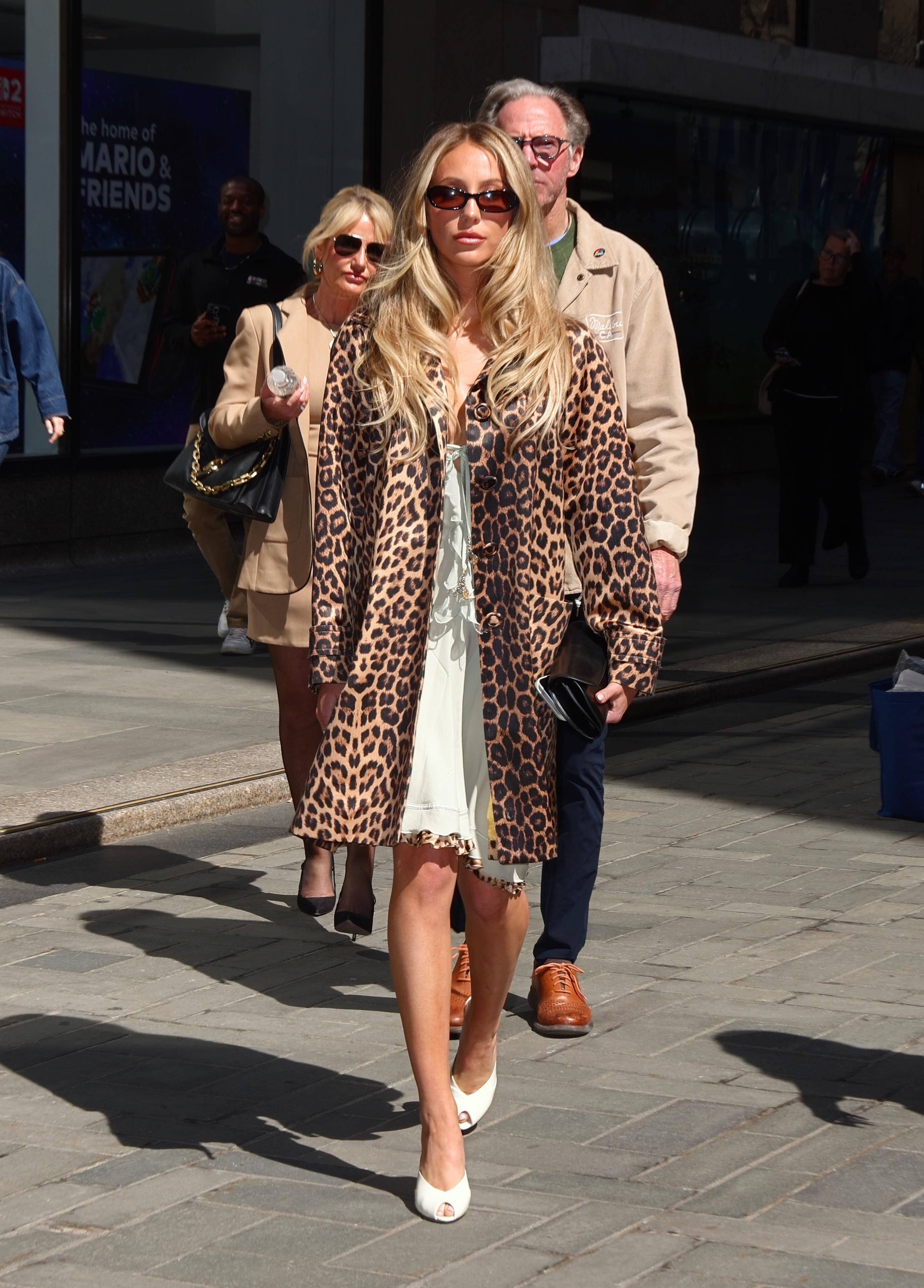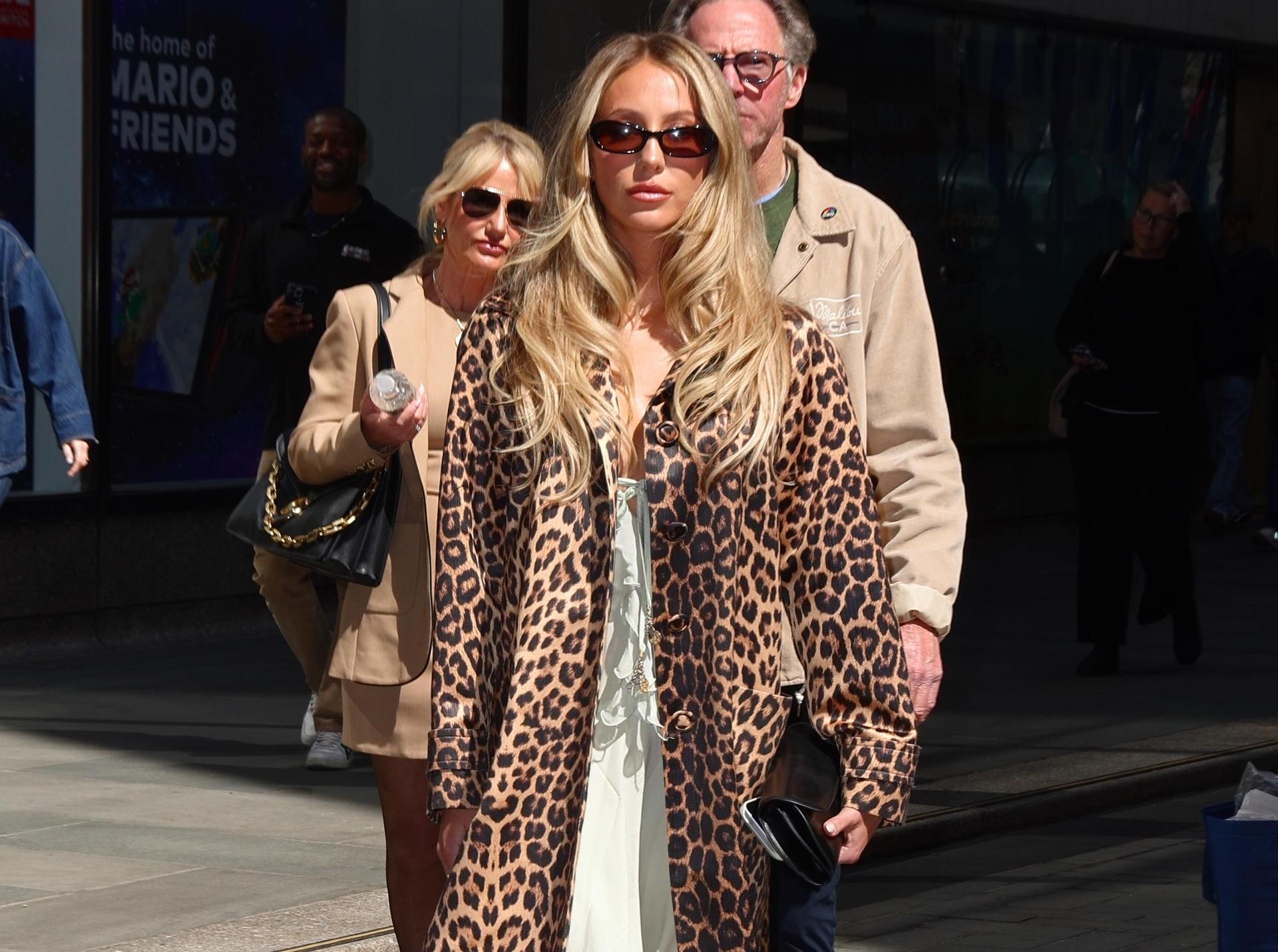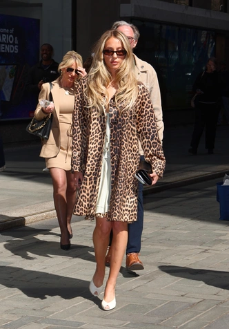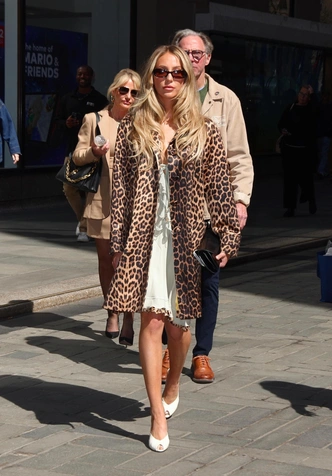 В весеннем образе Аликс леопардовое пальто играет роль полноценного акцента: свободный мужской силуэт и теплый карамельный оттенок делают анималистичный принт не кричащим, а идеально расслабленным. Нежное светлое платье-комбинация и белые туфли смягчают характер верха и превращают лук в современную версию старого голливудского гламура, где роскошь читается не по количеству деталей, а по тому, как уверенно в них чувствует себя сама героиня.