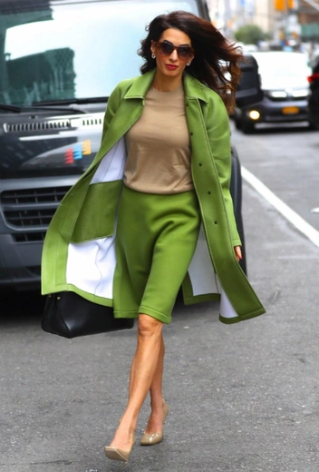 В Нью-Йорке кипят политические страсти — в период заседания Генассамблеи ООН по-другому и быть не может. На серию важных встреч съехались главы государств и политические лидеры, среди которых — Дональд Трамп, Владимир Зеленский, Борис Джонсон, Ангела Меркель и многие другие. Амаль Клуни, известный британский юрист и специалист по правам человека международного уровня, также прибыла на одну из встреч в рамках Генассамблеи, причем с очень серьезным настроем. Супруга Джорджа Клуни представила фирменный вариант power dressing, который получился как всегда безупречным: пальто и юбку в зеленом оттенке от Burberry дополнили бежевый джемпер и нюдовые туфли, а завершили образ солнцезащитные очки и классическая черная сумка.