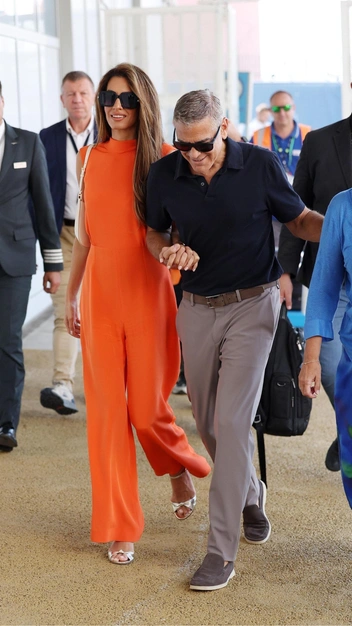 Яркая внешность Амаль Клуни требует ярких образов. Знаменитость вместе с супругом прибыла на остров Лидо на Венецианский кинофестиваль и сразу же покорила нас эффектным выходом. Она была замечена на лодке в безупречном расслабленном комбинезоне в модном оранжевом цвете. Его Амаль дополнила блестящими серебристыми босоножками в стиле нулевых, широкими очками и сумкой в молочном оттенке.