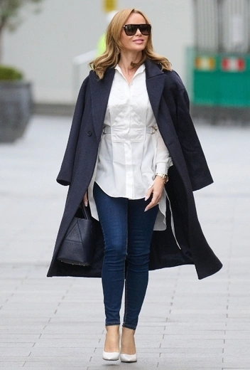 Одеваться просто, но со вкусом — формула, удачно применять которую на ежедневной основе получается далеко не у всех селебрити. Однако для леди, профессия которых — ежедневно появляться на телеэкранах, быть стильными, но не навязчивыми, этот прием является одним из базовых при составлении деловых образов на каждый день. Так, Аманда Холден предпочитает удобное и универсальное сочетание белой блузы, джинсов скинни и белых туфлей-лодочек, которые особенно гармонично смотрятся в комбинации с темно-синим пальто.