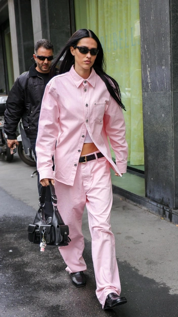 Этой осенью снимаем все черное и одеваемся в розовый тотал-лук, как это сделала Амелия Грей во время Недели моды в Милане. Знаменитость примерила укороченный белый топ, надела поверх него рубашку и застегнула ее лишь на верхние пуговицы. Брюки на низкой посадке она подчеркнула акцентным черным ремнем и грубыми лоферами. Завершили аутфит очки в стиле нулевых и сумка с накладными карманами.