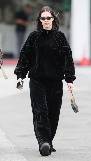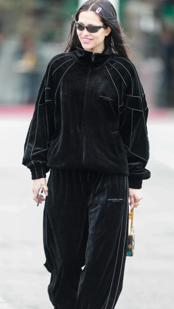 Спортивная одежда со времен коранивирусной пандемии не покидает хронику стритстайла, и это вновь нам доказала модель Амелия Хэмлин. Девушка появилась в черном винтажном велюровом костюме, украшенном оттеночными линиями и лампасами. К нему она подобрала идеальную сумочку Louis Vuitton, трендовые солнцезащитные очки. Романтичность образу Хэмлин добавила розовой заколкой, которую мы с вами носили в детстве.