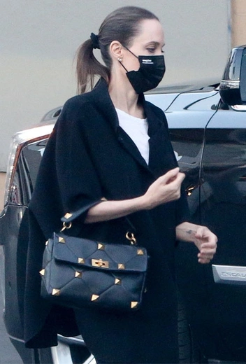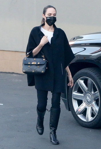 Самый выигрышный цвет Анджелины Джоли – черный. Именно в этом оттенке она чаще всего приобретает вещи. Правда, при составлении образов в темной палитре стоит также задумываться о том, чтобы образы получались небанальными и не слишком безликими. В этом Анджелине помогает простой лайфхак – добавлять трендовые детали образов в той же палитре. В одном из последних образов она решила примерить актуальные сапоги в жокейском стиле и дополнила образ одной из самых популярных сумок сезона – Valentino Roman Stud, которую уже облюбовали многие звезды.