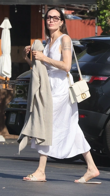 Анджелина Джоли обожает простые платья длины миди. Жарким летом актриса носит модель белого цвета на запах. Платье без рукавов селебрити дополнила лаконичными слайдами на плоском ходу, кремовой сумкой кросс-боди Dior и крупными солнцезащитными очками.