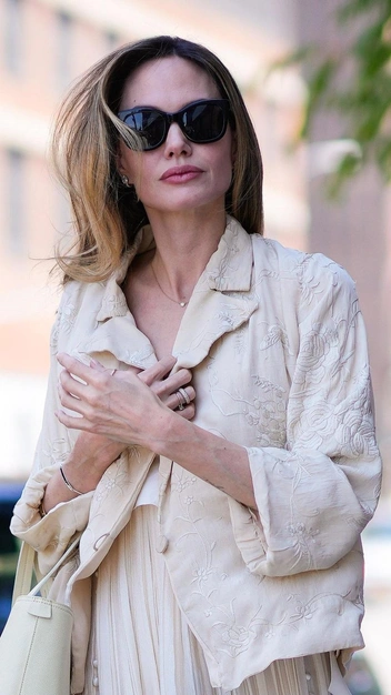 Стиль Анджелины Джоли узнаваем: в нем только благородные оттенки, струящиеся ткани и вечная классика — именно это доказал ее недавний выход. Актриса выбрала тотал-лук в молочном цвете, что считается статусным и роскошным. Она надела плиссированное платье длины макси, накинула поверх него свободный жакет в винтажном стиле. Подобрала Анджелина Джоли аксессуары также под тон наряда: объемную фактурную сумку и белоснежные босоножки на платформе.