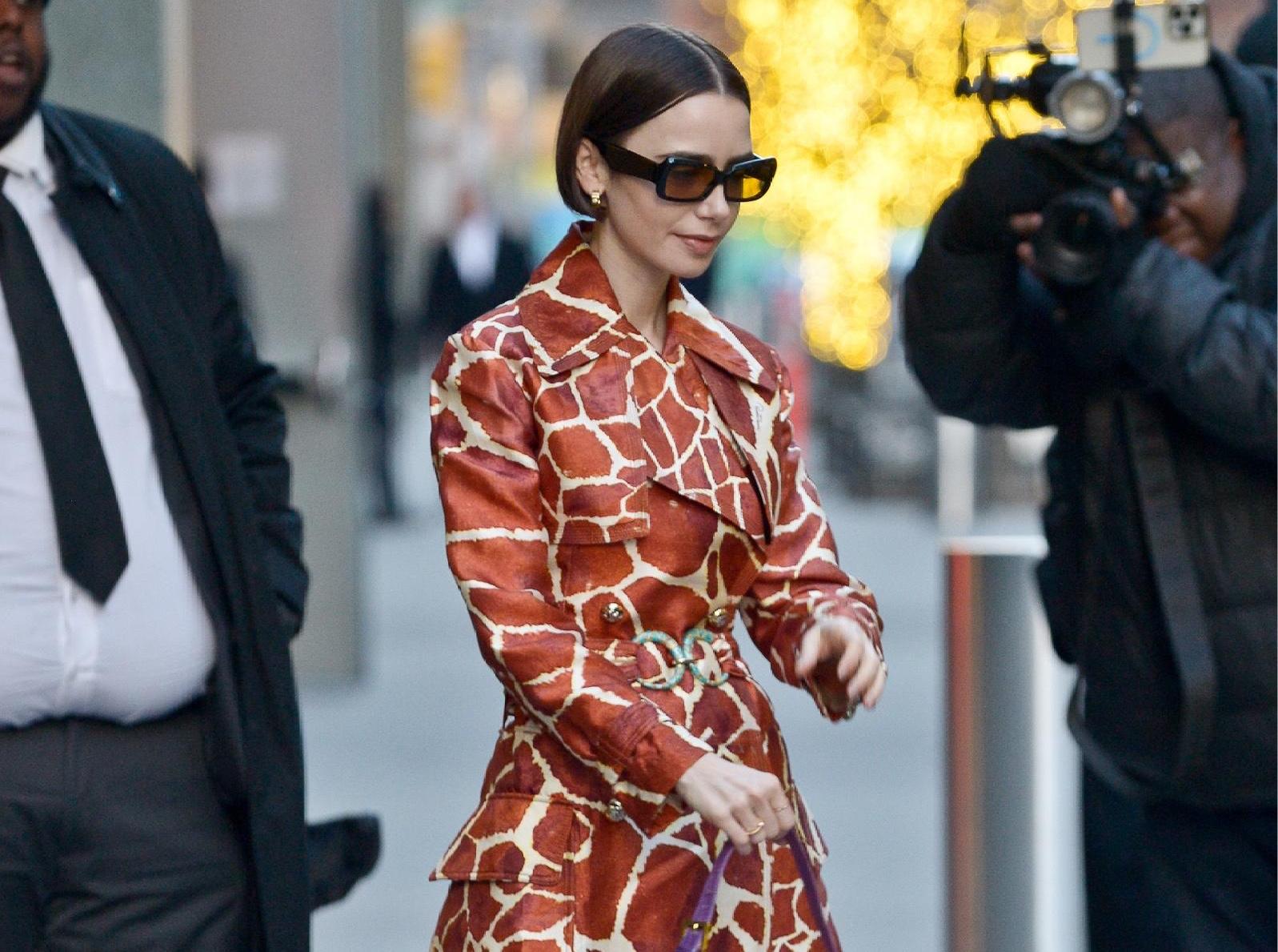 Анималистичные принты не собираются сдавать позиции и только расширяют свои вариации — теперь в гардеробе селебрити и инфлюенсеров появился даже «жираф». Лили Коллинз уже примерила этот рисунок: мягкое пальто с крупным принтом становится главным героем образа и спокойно заменяет любые другие детали. Фиолетовая Fendi Baguette добавляет «жирафу» модный цветовой акцент, а лаконичные босоножки оставляют в фокусе графику пальто и игру фактур — идеальный образ для романтического вечера или встречи с друзьями, когда надо выглядеть на все сто.