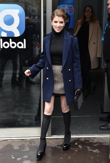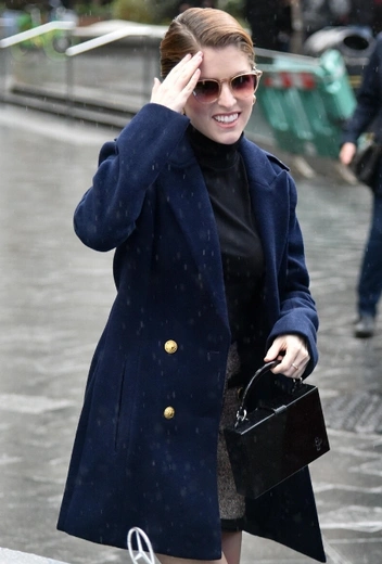 Анна подобрала модный фэшн-лук в стиле герцогини Кембриджской: укороченное классическое темно-синее пальто с крупными пуговицами дополнили серая юбка из плотной ткани, черная водолазка и туфли на массивном каблуке в тон верха. Аутфит дополнили квадратный клатч и очки с розовыми линзами. Отличный вариант наряда для похода в офис в грядущем сезоне SS20.