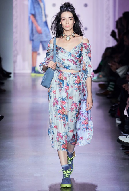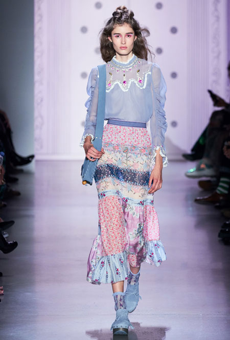 Новый показ бренда именовался VICTORIANNA – и уже из названия легко понять, чем в новом сезоне вдохновлялась основательница американского бренда. Для весны и лета Энна Суи решила объединить свою любимую бохо-эстетику с классическими составляющими викторианского стиля: рюшами, кружевными вставками, платьями с пышными рукавами-буфами и воротниками-стойками. Ключевой палитрой нового сезона были выбраны оттенки сладкой ваты и десертные цвета: нежный фиалковый, розовый, бирюзовый, оттенки лимонного парфе и клубничного сорбета.