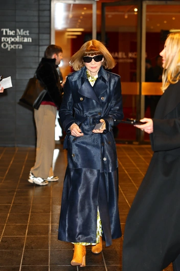 Анна Винтур снова демонстрирует свой беспроигрышный аутфит: длинный кожаный тренч, миди и сапоги. Темно‑синий плащ с поясом она носит поверх яркого платья и сочных рыжих ботильонов — та самая формула, к которой Анна возвращается годами: выразительное пальто, акцентная обувь, высокий каблук и еще немного цвета в аксессуарах, чтобы даже путь от машины до входа на показ выглядел как кадр редакционной съемки Vogue.