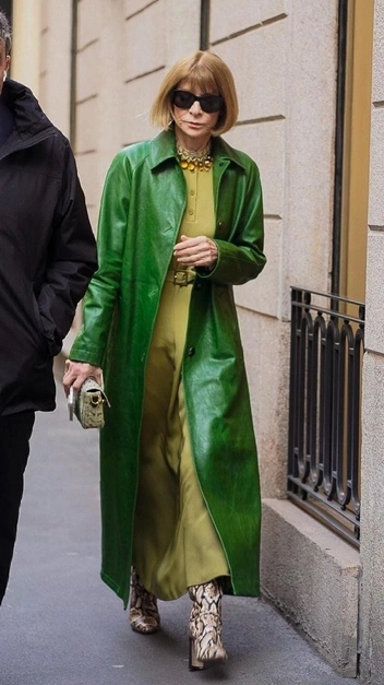 Анна Винтур продолжает прививать нам любовь к цвету. На этот раз знаменитость сменила фиолетовый плащ на насыщенный зеленый с эффектом винтажных потертостей. Модель прямого кроя она надела поверх безупречного-платья рубашки и показала главное стилевое правило: верхняя одежда должна прикрывать внутреннюю. Завершила журналистка выход аксессуарами: сапогами со змеиным принтом, очками, сумкой.