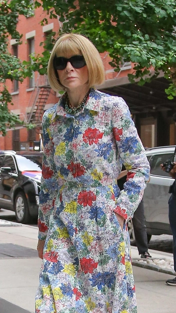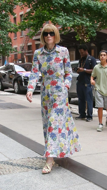 Платье-рубашка — одна из самых стильных моделей, которая никогда не утратит свою актуальность. Она есть практически в любом гардеробе, в том числе и Анны Винтур. Главный редактор Vogue и самая влиятельная женщина в мире моды является большой поклонницей платьев-рубашек с цветочным узором, и одно из них она продемонстрировала в новом выходе. К наряду звезда подобрала бежевые босоножки, крупные очки и множество украшений.