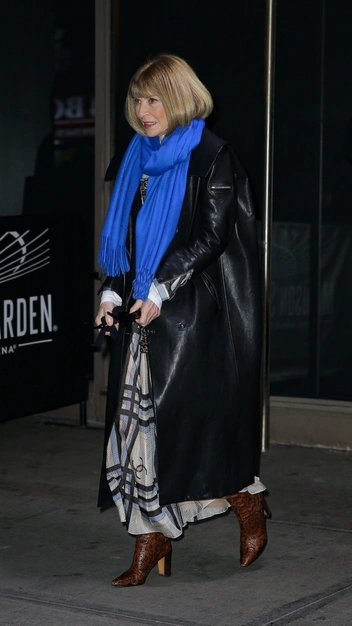 За Анной Винтур всегда пристальное внимание, ведь всем хочется знать, как одевается самая влиятельная женщина в фэшн-индустрии. Главный редактор американского Vogue в образе отдала предпочтение длинному платью-рубашке в клетку, поверх которого она надела тяжелый кожаный плащ. Однако главную роль в аутфите играют аксессуары: коричневые сапоги с острым носом и акцентный синий шарф.