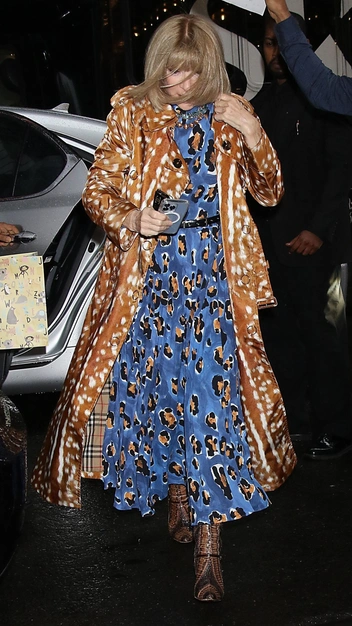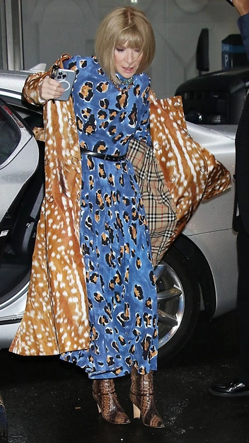 Если кто-то и знает о моде и трендах все, так это Анна Винтур. Бессменный редактор моды на протяжении многих лет остается верной своему фирменному стилю, всегда умело собирая новые и интересные образы. Важной составляющей гардероба редактора всегда были платья длины миди. На этот раз Анна выбрала модель с животным принтом, к которому добавила удлиненный плащ Burberry и сапоги с эффектом змеиной кожи.