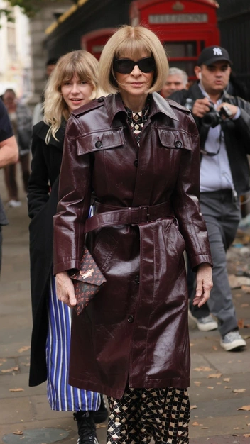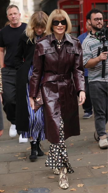 За редкими публичными выходами Анны Винтур следит весь мир. Как одевается главная женщина в индустрии моды? Например, она предпочитает платья-рубашки в длине макси в цветочном или геометрическом узоре. В качестве одежды главный редактор Vogue выбирает прямое кашемировое пальто или же плащ из плотной кожи. Именно такой в трендовом бордовом оттенке она и надела во время Недели моды в Лондоне.