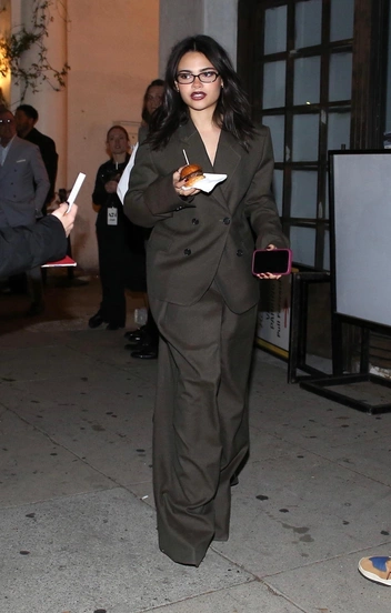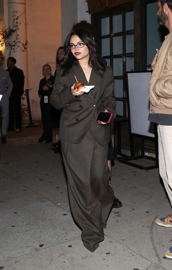 Звезда фильма «Барби» покидала ужин в Лос-Анджелесе и попала в объективы папарацци. На Ариане был брючный костюм оверсайз-кроя темно-коричнечвого цвета, который подчеркнул хрупкую фигуру актрисы. Образ дополнила бордовая помада, которая гармонично сочетается с оттенком одежды, а также очки в узкой оправе. Они вернулись в моду в 2024 году, когда появился тренд «офисная сирена». Такая девушка умеет выглядеть сексуально и даже провокационно в одежде делового стиля.