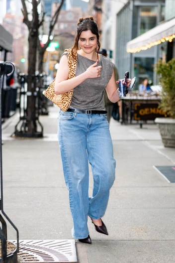 У Барби получился идеальный летний образ для города: простая серебристая майка без рукавов работает как универсальный топ на каждый день, а светло‑голубые джинсы с высокой посадкой придают комфорт и создают правильные пропорции силуэта. Темные заостренные мюли и леопардовая сумка‑шопер добавляют аутфиту характер и намек на вечерний глэм, так что в таком комплекте одинаково органично зайти и за утренним кофе, и забежать на спонтанный аперитив после работы.