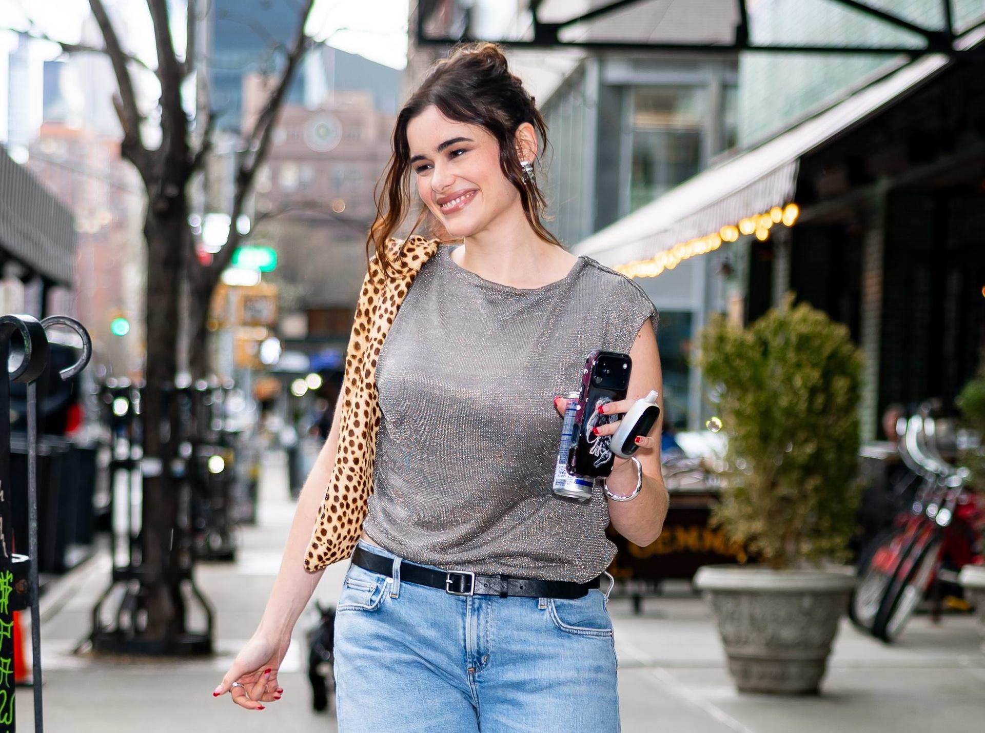 У Барби получился идеальный летний образ для города: простая серебристая майка без рукавов работает как универсальный топ на каждый день, а светло‑голубые джинсы с высокой посадкой придают комфорт и создают правильные пропорции силуэта. Темные заостренные мюли и леопардовая сумка‑шопер добавляют аутфиту характер и намек на вечерний глэм, так что в таком комплекте одинаково органично зайти и за утренним кофе, и забежать на спонтанный аперитив после работы.