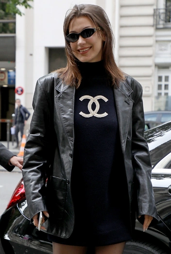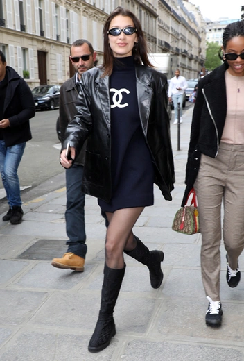 2 мая в Париже была замечена Белла Хадид: топ-модель бодрым шагом направлялась в бутик французского бренда Chanel. Наряд Беллы — отличный пример того, как можно стилизовать короткое трикотажное платье: кожаный жакет, сапоги и пара узких очков справятся с этой задачей на «отлично».