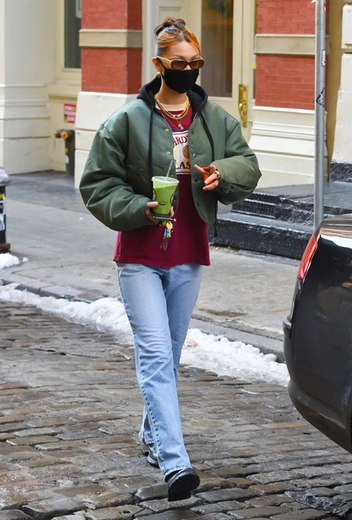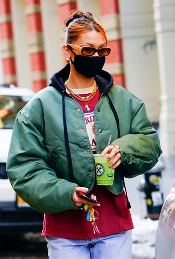 В повседневных луках модели Белле Хадид нет равных. Девушка обожает экспериментировать с маскулинным стилем и интегрировать его в собственный гардероб, комбинируя с женственными вещами. Накануне она представила образ в своем любимом расслабленном стиле спорт-шик. Девушка выбрала свободные джинсы прямого кроя, расслабленную футболку с принтом и укороченный бомбер. Завершающими штрихами аутфита стали очки и золотые украшения.