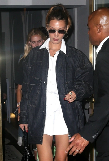 Носить мини-модели в исполнении легких тканей всегда рискованно, и кому, как не моделям, об этом знать. Впрочем, Беллу Хадид не испугать никакой длиной и даже самое короткое платье-рубашку она умеет носить стильно и не вычурно. В этом аутфите супермодель смягчает звучание образа с помощью объемной джинсовой куртки и элегантных высоких сапог. В итоге образ приобретает более повседневное звучание, но, пожалуй, только выигрывает от этого.
