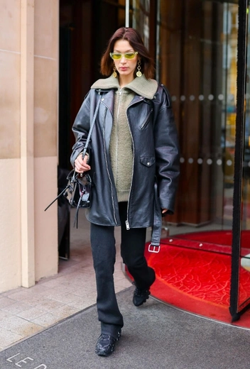 Во время Недель моды многие модели, активно участвующие в показах, любят отдохнуть от навороченных подиумных конструкций и примерить максимально расслабленные аутфиты, как только сходят с кэтуолка. Яркий тому пример — стритстайл Беллы Хадид в Париже. Черная кожаная куртка, теплая кофта, брюки, кроссовки — и все это в нейтральных оттенках, позволяющих расслабиться после подиумного колор-разнообразия. Свой аутфит младшая Хадид дополняет очками с неоновыми линзами, сумкой на одно плечо и золотыми серьгами, придающими полуспортивному фэшн-луку нотку гламура.