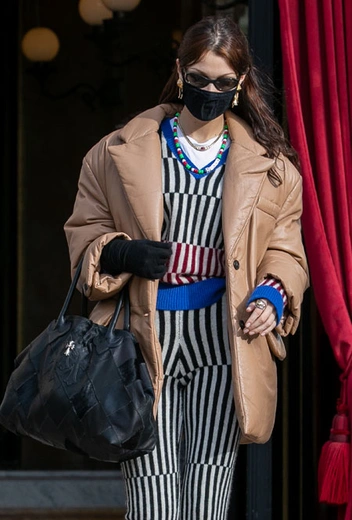 Для холодного сезона мы, как правило, выбираем сдержанные и лаконичные оттенки, поэтому нередко может показаться, что зимний гардероб слишком однообразный и скучный. Однако есть несколько приемов, как сделать его более ярким и красочным. Белла Хадид нашла универсальный способ – девушка решила экспериментировать с необычными принтами. Для короткой прогулки в Париже она выбрала трикотажный костюм с психоделическим принтом в полоску и завершила образ лаконичным дутым пуховиком в карамельном оттенке.