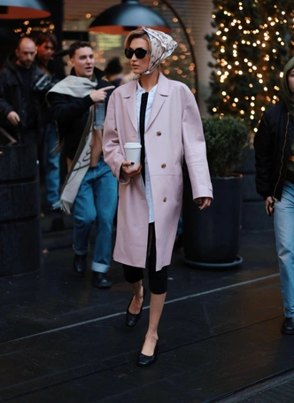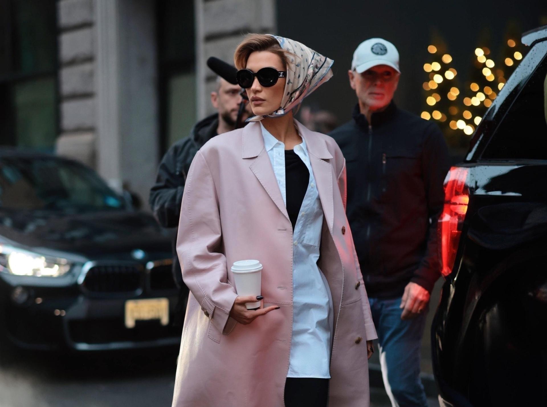 Белла выходит в образе, который будто сошел с подиума Prada: нежно‑розовое пальто прямого кроя поверх удлиненной белой рубашки и черных капри создает тот самый интеллектуальный, чуть ретро силуэт, который так любит Миучча. Шелковый платок, завязанный по‑европейски на голове, и простые балетки усиливают настроение итальянской кинодивы, а стаканчик кофе в руке «приземляет» аутфит до городского, показывая, как носить подиумную эстетику в реальной жизни.