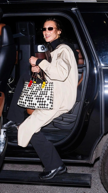 Сейчас Белла Хадид редко появляется на публичных мероприятиях, но если появляется, то всегда становится трендсеттером, демонстрируя эффектные образы. Например, недавно она примерила черный бадлон, который заправила в прямые брюки. Акцент в монохромном аутфите она сделала на элегантный бежевый плащ с коричневым подкладом и обратила наше внимание на аксессуары. В качестве сумки топ-модель выбрала разноцветный тоут, а в качестве обуви — лоферы с квадратным мысом.