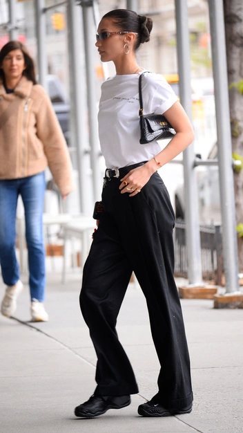 Белла Хадид обратилась к классическому черно-белому сочетанию: звезда надела широкие брюки из костюмной ткани, в которые заправила белую футболку. Лаконичный образ звезда щедро разбавила аксессуарами: кожаным ремнем с металлической пряжкой, стильной миниатюрной сумкой на плечо, золотыми украшениями и самыми модными очками этого сезона в стиле нулевых.
